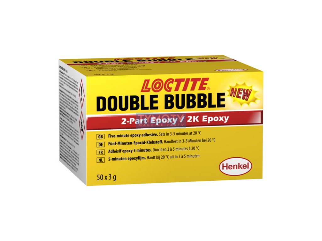.. Loctite Double Bubble je rychle vytvrzující dvousložkové epoxidové lepidlo pro všeobecné použití na rychlé opravy. Lze s ním lepit širokou škálu materiálů, např. dřevo, kovy, sklo, keramiku a některé plasty. Dodává se v jednorázovém dvojitém sáčku pro snadnou manipulaci spolu s míchací podložkou a dřevěnou špachtlí. Obal zabezpečuje správný mísicí poměr složek lepidla.