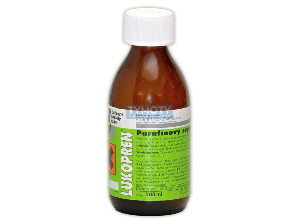 Lukopren parafínový separátor - 200 ml Lukopren Parafínový Separátor - Separácia zle zmáčavých povrchov. Separačný prostriedok na báze parafínu v bezaromátovom rozpúšťadle slúžiaci na separáciu silikónových jednozložkových tmelov Lukopren S a dvojzložkových kaučukov Lukopren N. Pomocné prípravky sú určené na zvýšenie úžitkovej hodnoty silikónových jednozložkových tmelov LUKOPREN S a dvojzložkových kaučukov na rozšírenie ich aplikačného spektra. balenie : fľaštička výrobca : Lučebné závody as Kolín (Lukopren)